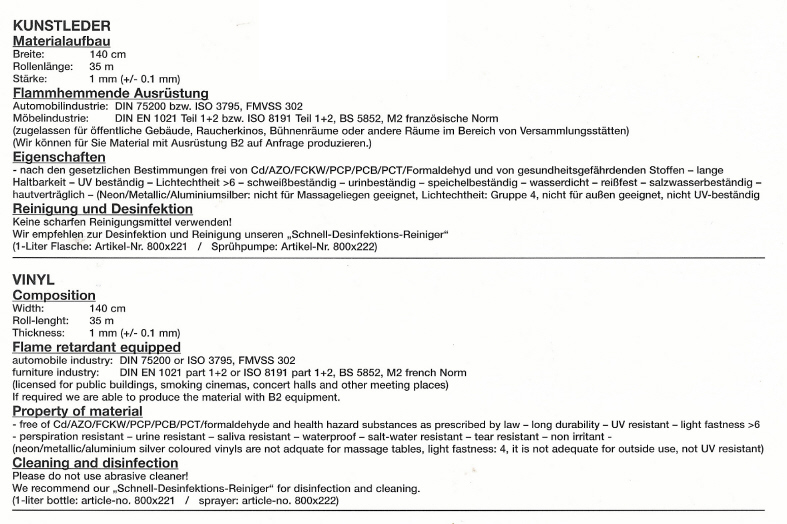 nach den gesetzlichen Bestimmungen frei von: Cd/AZO/FCKW/PCP/PCB/PCT/Formaldehyd, gesundheitsschädlichen Stoffen, lange Haltbarkeit, UV beständig, schweißbeständig, speichel-, u. urinbeständig, wasserdicht, reißfest, salzwasserbeständig